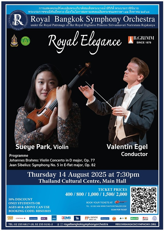 ENTERTAINMENT Royal Elegance วันที่ 14 สิงหาคม พ.ศ. 2568 | เวลา 19:30 น. ณ หอประชุมใหญ่ ศูนย์วัฒนธรรมแห่งประเทศไทย จัดแสดงโดย วงรอยัลแบงค์คอกซิมโฟนีออร์เคสตร้า (RBSO) สิงหาคม 4, 2025