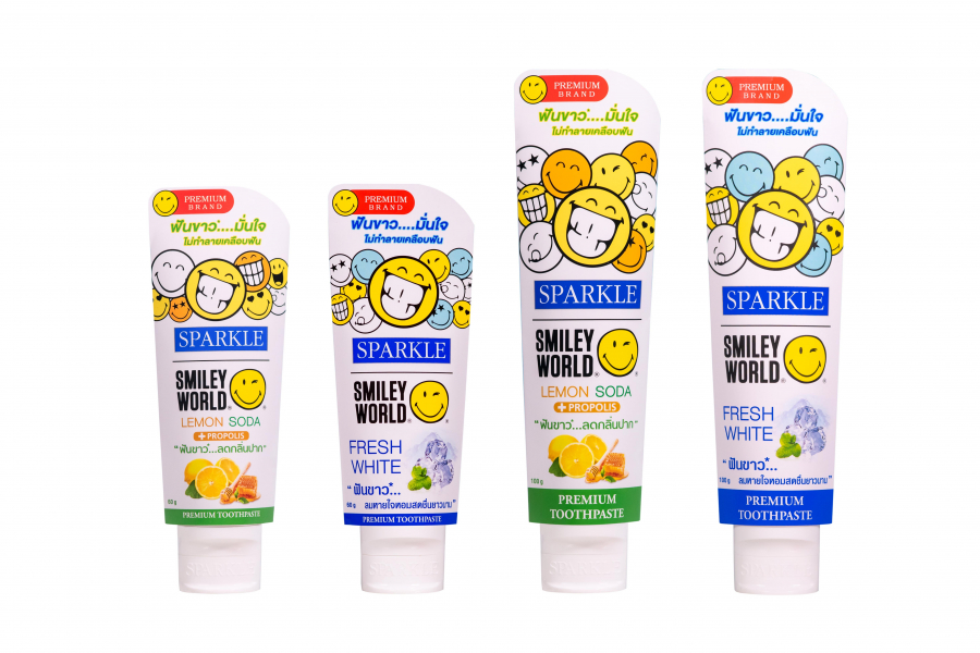 - ยาสีฟัน SPARKLE DOUBLE WHITE สูตร LEMON SODA รุ่น SMILEYWORLD ที่คิดค้นและเป็นสูตรเฉพาะ ที่ช่วยให้ฟันขาวขึ้น 2 เท่า ด้วย Micro White Silica จากประเทศสหรัฐอเมริกา และช่วยลดการสะสมของแบคทีเรียในช่องปากด้วยสารสกัด Propolis พร้อมเติมความสดชื่น ลมหายใจสะอาด ช่องปากชุ่มชื่น ด้วยส่วนผสมของ Nano Vitamin C จากประเทศเยอรมนี อนุภาคขนาดเล็กพิเศษ 30 นาโนเมตร ช่วยบำรุงเหงือกให้แข็งแรง มีสุขภาพดี และลดการสะสมเชื้อแบคทีเรีย สาเหตุของกลิ่นปาก Cyclodextrin (CDX) ลดกลิ่นปาก ลมหายใจสดชื่น ปราศจากสาร SLS และ Paraben (ขนาด 60 กรัม ราคา 79 บาท 100 กรัม ราคา 129 บาท)