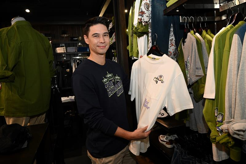 ดีเทลสกรีนลาย Buzz Lightyear และ Aliens ตรงบริเวณแขนเสื้อ, เสื้อแจ็คเก็ตสีเขียวโอลีฟปักลาย Woody แบบคอสติส แถมด้วยไอเทมเสื้อที่สามารถใส่คู่กันได้ทั้งผู้ชายและผู้หญิง ไม่ว่าจะเป็นเสื้อฮู้ดดี้สีน้ำเงิน, เสื้อเชิ้ตลายทางทรงโอเวอร์ไซส์ปักลาย Woody, เสื้อยืดสีขาวแบบมีกระเป๋าปักลาย Buzz Lightyear และเสื้อยืดสีน้ำเงินสกรีนลาย Aliens สีเขียวสดใส