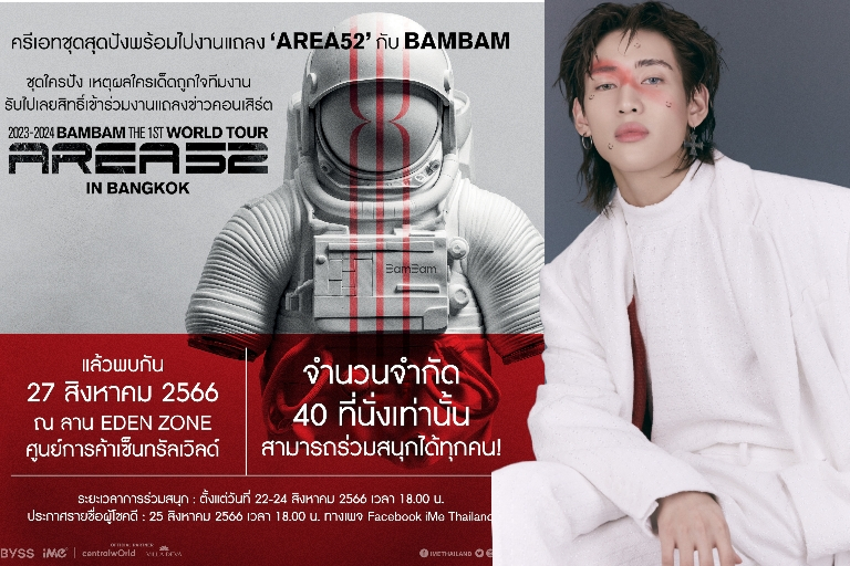 ซึ่งสำหรับงานคอนเสิร์ต “2023-2024 BamBam THE 1ST WORLD TOUR [AREA 52] in BANGKOK” ที่กำลังจะเกิดขึ้นในวันเสาร์ที่ 28 ตุลาคม 2566 ณ ธันเดอร์โดม สเตเดี่ยม (Thunderdome Stadium) เวลา 17.00 น. พร้อมเปิดสนามรบสู่วันเปิดขายบัตรพร้อมกันแล้วในวันอาทิตย์ที่ 10 กันยายน 2566 ตั้งแต่เวลา 10.00 น. เป็นต้นไป ผ่านทางไทยทิกเก็ตเมเจอร์ทุกสาขา หรือ www.thaiticketmajor.com และ Call Center 02-262-3456 ราคาบัตร VVIP ‘AREA 52’ PACKAGE 9,700 บาท (บัตรยืน) / VIP ‘GOLD AREA’ PACKAGE 7,900 บาท (บัตรยืน) / 5,900 (บัตรยืน) / 4,900 (บัตรยืนและบัตรนั่ง) / 3,900 / 2,900 และ 2,500 บาท (บัตรนั่ง) พร้อมสิทธิพิเศษอัดแน่นให้เหล่าอากาเซ่ได้ใกล้ชิด พร้อมสนุกสุดมันส์ไปกับโชว์สุดพิเศษมากมาย ที่ “แบมแบม” กำลังขมักขเม้นเตรียมตัว เตรียมโชว์ทุกโชว์ให้พิเศษที่สุดเพื่อแฟนๆ ทุกคน