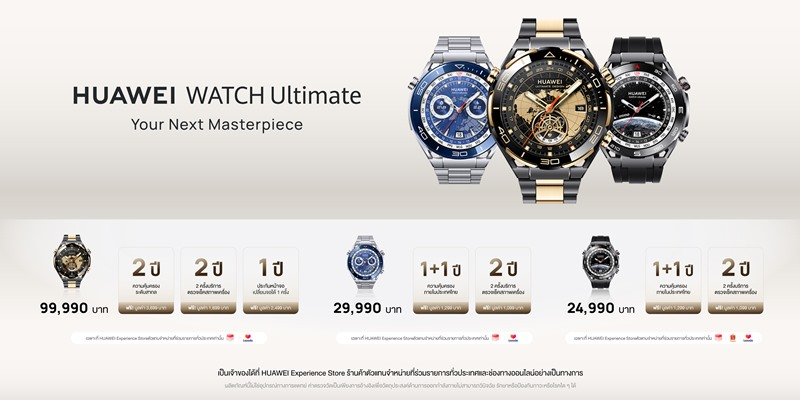 - HUAWEI WATCH Ultimate สี Expedition Black วางจำหน่ายในราคา 24,990 บาท พร้อมรับฟรี! บริการความคุ้มครองภายในประเทศ 2 ปี มูลค่า 1,299 บาท บริการตรวจเช็คสภาพเครื่อง 2 ครั้งในระยะเวลา 2 ปี มูลค่า 1,099 บาท ที่ HUAWEI Experience Store ร้านค้าตัวแทนจำหน่ายที่ร่วมรายการ และ HUAWEI Store รวมทั้งร้านค้าอย่างเป็นทางการของหัวเว่ยบนแพลตฟอร์มออนไลน์ Lazada และ Shopee