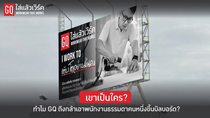 เพื่อเพิ่มความเข้มข้นให้กับแคมเปญ “GQ ใส่แล้วเวิร์ค WORKWEAR THAT WORKS” GQ ก้าวสู่สนามบิลบอร์ด ที่พร้อมฉีกกรอบการโฆษณาเสื้อผ้าแบบเดิม ๆ เปลี่ยนสปอตไลต์จากนายแบบ นางแบบทั่วไป มาเป็น 12 “คนรักงาน” ตัวจริงจากสายงานต่าง ๆ ที่ไม่ได้จำกัดอยู่ในออฟฟิศเท่านั้น ตั้งแต่คุณครู เชฟ นักวิจัย โฆษก และอื่น ๆ ที่จะมาร่วมเล่าถึงเหตุผลที่เป็นแรงผลักดัน ที่คอยขับเคลื่อนให้เขาตั้งใจทำงาน พร้อมตั้งคำถามกับคนทำงานทุกคนว่าเรา “ทำงานเพื่ออะไร?”