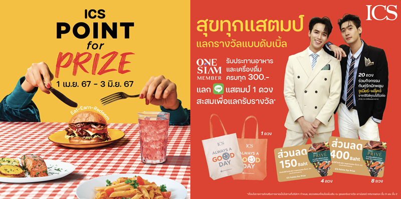 ทั้งนี้ ไอซีเอสยังจัดโปรโมชั่นสุดพิเศษ “ICS POINT for PRIZE” สุขทุกแสตมป์ แลกรางวัลแบบดับเบิ้ล ตั้งแต่วันที่ 1 เมษายน – 3 มิถุนายน 2567 สมาชิก ONESIAM รับประทานอาหารและเครื่องดื่ม ภายในไอซีเอส ครบทุก 300 บาท สามารถนำใบเสร็จมาแลก Line แสตมป์ 1 ดวง (จำกัด 3 ดวง/ท่าน/วัน) สะสมครบ 1 ดวง แลกรับ กระเป๋าผ้า ICS จำนวน 1 ใบ, สะสมครบ 4 ดวง แลกรับ คูปองส่วนลด Lotus’s Privé มูลค่า 150 บาท สำหรับการซื้อสินค้าครั้งต่อไปขั้นต่ำ 300 บาท , สะสมครบ 8 ดวง แลกรับ คูปองส่วนลด Lotus’s Privé มูลค่า 400 บาท สำหรับการซื้อสินค้าครั้งต่อไปขั้นต่ำ 800 บาท, สะสมครบ 20 ดวง แลกรับสิทธิ์ร่วมทำกิจกรรมสุดพิเศษ! Exclusive Fan Meet กับคู่รักนักหยุม จูเนียร์ กาจบัณฑิต และฟลุ๊คจ์ พงศภัทร์ จากซีรีส์คุณได้ไปต่อ วันที่ 13 มิ.ย. 67 เวลา 11.00 น. ที่ YOU&I Premium SUKI BUFFET ชั้น 4 ไอซีเอส