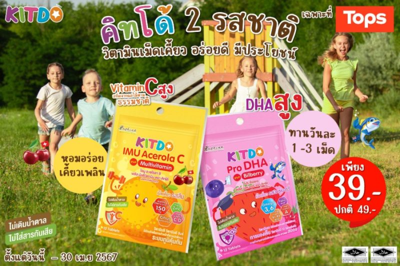 “คิทโด้” วิตามินชนิดเคี้ยว มี 2 สูตร 2 รสชาติ ช่วยเสริมสร้างระบบภูมิคุ้มกัน และบำรุงสมองและสายตาที่ดีของน้องๆ หนูๆ และทานได้ทุกเพศทุกวัย ทานได้ทุกวัน อัดแน่นไปด้วยคุณภาพพร้อมประโยชน์เน้นๆ อุดมไปด้วยสารอาหารที่จำเป็นครบถ้วนในแต่ละวัน “คิทโด้” ได้จัดโปรโมชั่นสุดคุ้มตลอดเดือนเมษายน ราคาพิเศษ คิทโด้ 1 ซอง บรรจุ 12 เม็ด แถมฟรีอีก 3 เม็ด (แถมในซอง) รวมเป็น 15 เม็ด/ซอง พิเศษซองละ 39 บาท จากปกติ 49 บาท ช่วยประหยัดถึง 10 บาท สามารถซื้อได้ตั้งแต่วันนี้ – 30 เมษายน 2567 ที่ Tops ทุกสาขาทั่วประเทศ