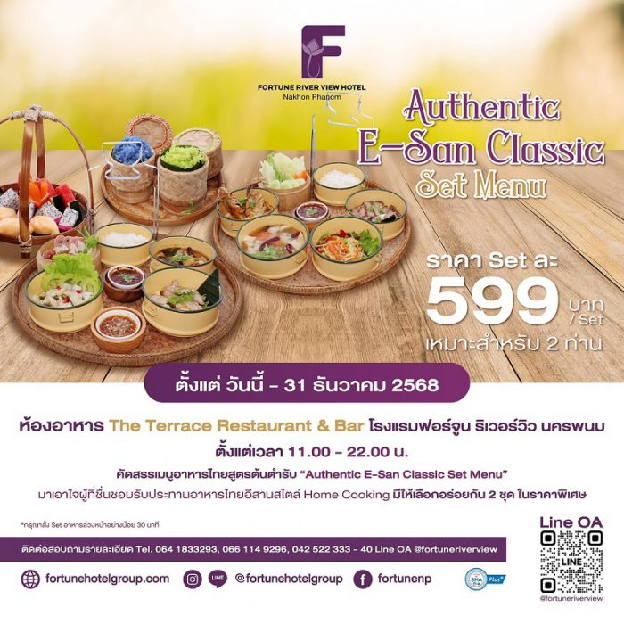 ห้องอาหาร The Terrace Restaurant & Bar คัดสรรเมนูอาหารไทยแท้สูตรต้นตำรับ “Authentic E-San Classic Set Menu” เอาใจคนรักอาหารไทยอีสานสไตล์ Home Cooking มีให้เลือกความอร่อยกัน 2 เซต กับเมนูอันหลากหลาย ในราคาพิเศษ! เพียงชุดละ 599 บาท (สำหรับ 2 ท่าน) ตั้งแต่วันนี้ – 31 ธันวาคม 2568