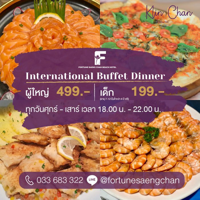 เชิญชวนทุกท่านมาอิ่มไม่อั้นกับ International Buffet Dinner เติมเต็มมื้อค่ำสุดพิเศษด้วยบุฟเฟต์นานาชาติจัดเต็มทุกวันศุกร์ – อาทิตย์ ตั้งแต่เวลา 18.00 – 22.00 น.