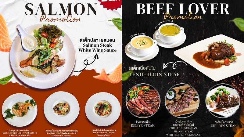 ช่วงนี้ขอแนะนำโปรโมชั่น Beef Lover Promotion สำหรับผุ้ที่ชื่นชอบเนื้อ เมนูสายเนื้อมีให้เลือก อาทิเช่น สเต็กเนื้อสันใน Tenderloin Steak / ริบอายสเต็ก Ribeye Steak / เนื้อสันนอกย่างซอสทรัฟเฟิลไอโอลี่ซอส Grilled Australian Sirloin Steak with Truffle Aioli Sauce / สเต็กเนื้อสันนอก Sirloin Steak ทุกเมนูแถมฟรี ซุปข้าวโพด หรือ ซุปฟักทอง