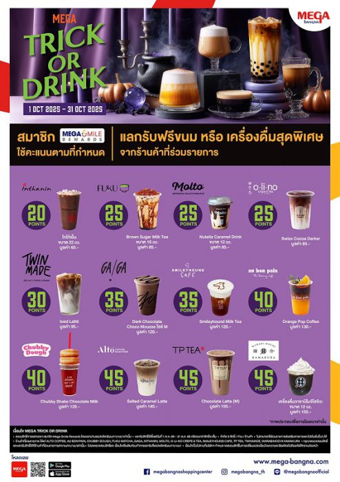 สัมผัสทั้งรสชาติความอร่อยไปพร้อมกับกลิ่นอายฮาโลวีน ในแคมเปญ “MEGA TRICK OR DRINK” ด้วยเมนูเครื่องดื่มสุดฮิตจากคาเฟ่แบรนด์ดัง ให้ทุกคนได้ออกตามล่าเครื่องดื่มแก้วโปรด พร้อมอัปเดตเทรนด์ความอร่อยสำหรับซีซั่นนี้ ตั้งแต่ วันนี้ – 31 ตุลาคม 2568 ที่ศูนย์การค้าเมกาบางนาเท่านั้น ดูรายละเอียดเพิ่มเติมหรือเงื่อนไขการแลกรับได้ที่แอปพลิเคชันเมกาบางนา, เฟซบุ๊ก : FACEBOOK.COM/MEGABANGNASHOPPINGCENTER และ ไลน์ : @MEGABANGNAOFFICIAL