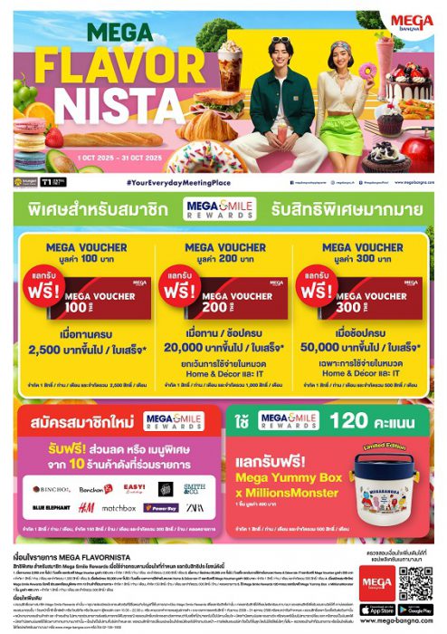 ศูนย์การค้าเมกาบางนา แหล่งช้อปปิ้งที่ใหญ่ที่สุดแห่งกรุงเทพฯ ฝั่งตะวันออก พร้อมเติมเต็มประสบการณ์การใช้ชีวิตให้ทุกๆ วันมีความสุขมากยิ่งขึ้น ด้วยแนวคิด YOUR EVERYDAY MEETING PLACE ตอกย้ำความเป็น ‘FOOD DESTINATION’ ของกรุงเทพฯ ตะวันออกที่ครบครันที่สุด จัดแคมเปญ “MEGA FLAVORNISTA” ตั้งแต่วันที่ 1 – 31 ตุลาคม 2568 ชวนเหล่านักชิมมาสัมผัสรสชาติความอร่อย จากร้านอาหารแบรนด์ดังมากกว่า 200 ร้าน ครอบคลุมทั้งไทย จีน ญี่ปุ่น เกาหลี ตะวันตก คาเฟ่ และของหวาน ครบทุกสไตล์ความอร่อยในที่เดียว ให้ทุกมื้ออร่อยคือโมเมนต์แห่งความสุข พร้อมไฮไลต์สุดพิเศษ! เพียงใช้คะแนนเมกา สไมล์ รีวอร์ดส 120 คะแนน แลกรับฟรี! “MEGA YUMMY BOX X MILLIONSMONSTER” กล่องเก็บความอร่อยลายลิมิเต็ด อิดิชัน ออกแบบโดย “AnOfficerDies” หรือ กอล์ฟ – ฐิติภูมิ เพ็ชรสังข์ฆาต ศิลปินนักวาดภาพประกอบชื่อดังเจ้าของลายเส้น “Millionsmonster”