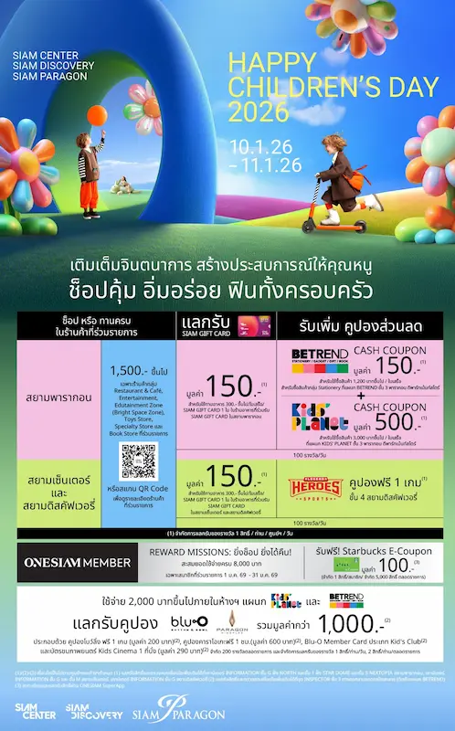 พิเศษยิ่งขึ้นในช่วงวันเด็กแห่งชาติ สยามพารากอนยังจัดเต็มโปรโมชั่นและสิทธิพิเศษจากร้านอาหารที่ร่วมรายการ กับโปรโมชั่น “HAPPY CHILDREN’S DAY 2026” ระหว่างวันที่ 10.01.26 – 11.01.26