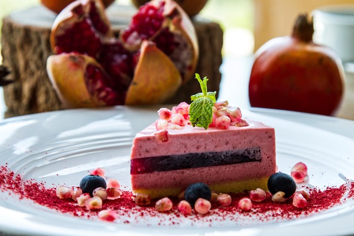 ปิดท้ายมื้อพิเศษให้สมบูรณ์แบบยิ่งขึ้นด้วยเมนูของหวาน ได้แก่ มะม่วงบาวาโรส (Mango Bavarois) ราคา 150 บาท หรือ ทับทิมมูส (Pomegranate Jelly Mousse) ราคา 150 บาท