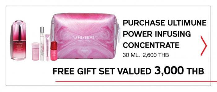 4. เมื่อซื้อ SHISEIDO Ultimune Power Infusing Concentrate ขนาด 30 มล. มูลค่า 2,600 บาท รับฟรีเซ็ทของแถมสุดพิเศษมูลค่า 3,000 บาท