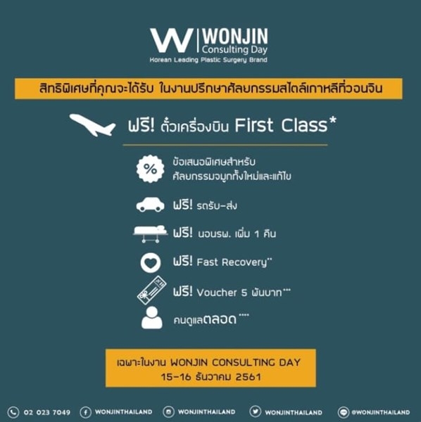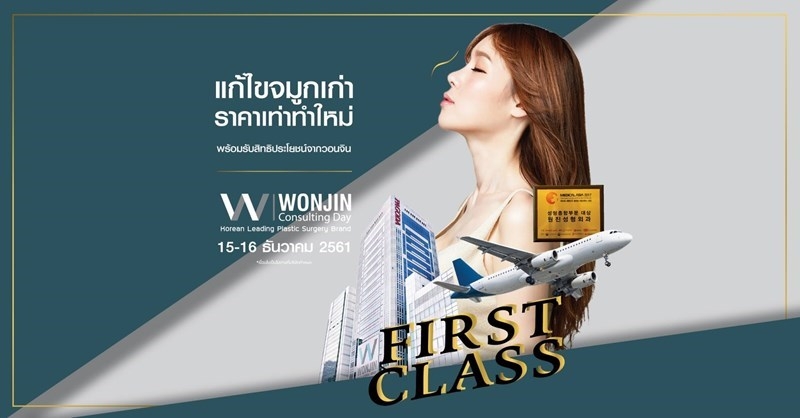 พิเศษตั๋วเครื่องบินชั้น First Class* ให้คุณบินไปศัลยกรรมแบบสุดหรู แถมไม่ต้องอยู่เกาหลีนาน 14 วัน เพราะสามารถกลับมาดูแลต่อที่วอนจิน ประเทศไทย แบบข้อเสนอสุดพิเศษ! ให้คุณแก้จมูก เท่ากับราคาทำจมูกใหม่