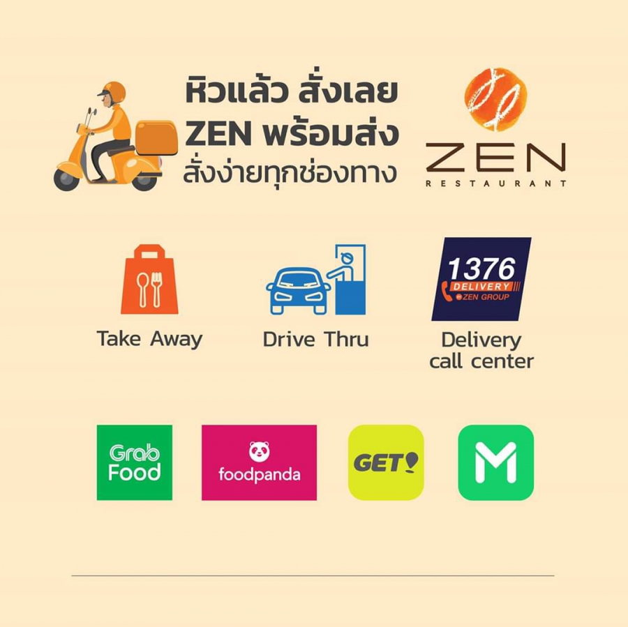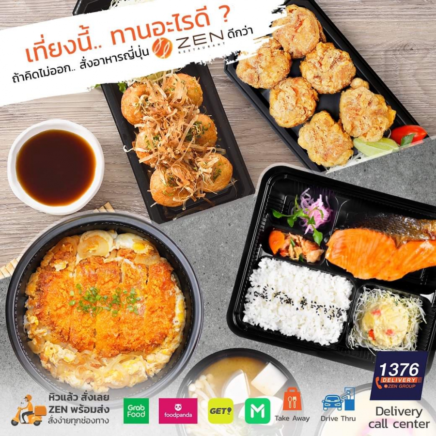 พร้อมเสิร์ฟความอร่อย ถึงบ้านคุณแล้ววันนี้ กับหลากหลายช่องทาง เดลิเวอรี่ Zen Delivery 1376 หิวแล้ว สั่งเลย หรือสั่งผ่านแอพพลิเคชั่น GrabFood, GET, foodpanda , และ LineMan