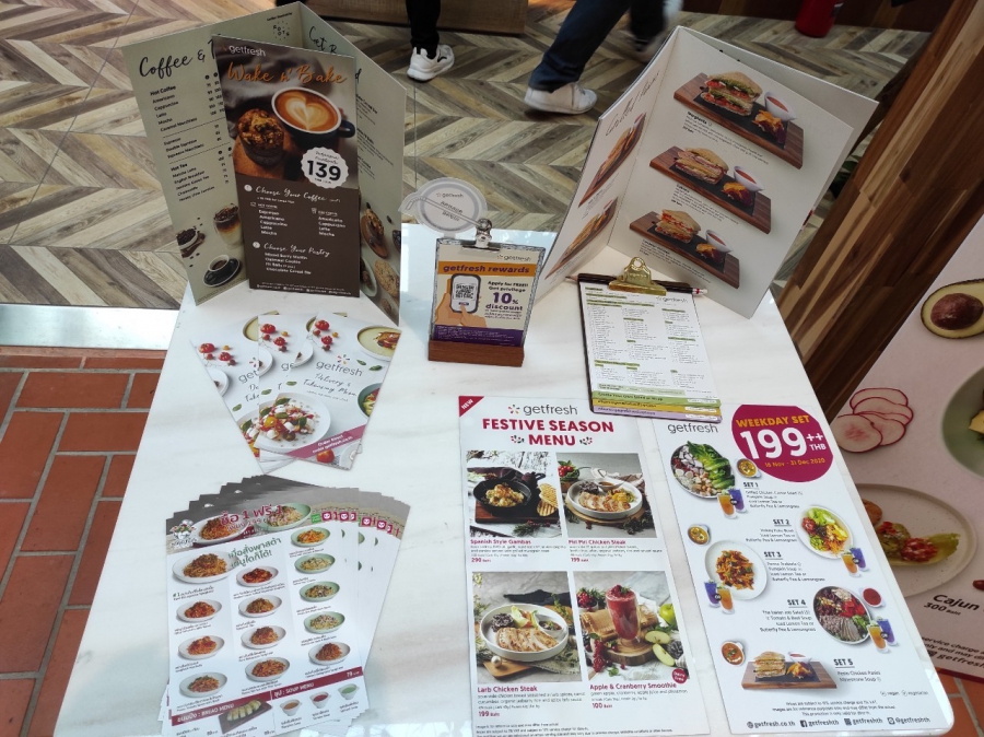 เมนูอาหารจาก “เก็ตเฟรช” ทางแบรนด์มีความตั้งใจจะนำเสนออาหารออกเป็น 2 ประเภท คือ เมนูอาหารที่รังสรรค์จากเชฟที่มีให้เลือกรับประทานอย่างหลากหลาย และเมนูอาหารที่ลูกค้าสามารถออกแบบได้ด้วยตัวเองตามความชอบ โดยลูกค้าสามารถเลือกได้เองว่าอยากใส่วัตถุดิบอะไรบ้างในแต่ละจาน โดยจุดเด่น อยู่ที่วัตถุดิบทั้งหมด เป็นวัตถุดิบคุณภาพดี และเป็นมิตรต่อสิ่งแวดล้อม