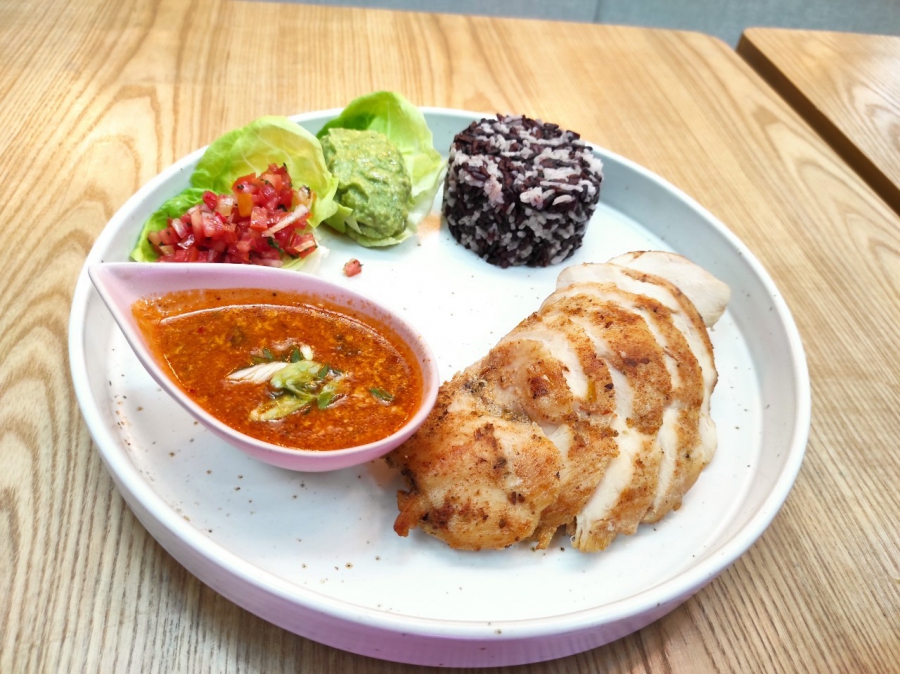 อกไก่หมักเครื่องเทศคาจัน เสิร์ฟพร้อมกับอาโวคาโดบด ซัลซามะเขือเทศ เสิร์ฟคู่กับข้าวแจสเบอร์รี่ออร์แกนิก 300.00 ฿