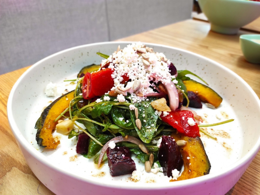 สลัดฟักทองญี่ปุ่นย่าง เสิร์ฟพร้อมกับบีทรูท ผักร็อกเก็ต เมล็ดทานตะวัน เฟต้าชีส ราดด้วยน้ำสลัดฮันนี่บัลซามิก ราคาปกติ 180.00 ฿ สามารถเลือกครีเอทผักอื่นๆ ตามชอบ