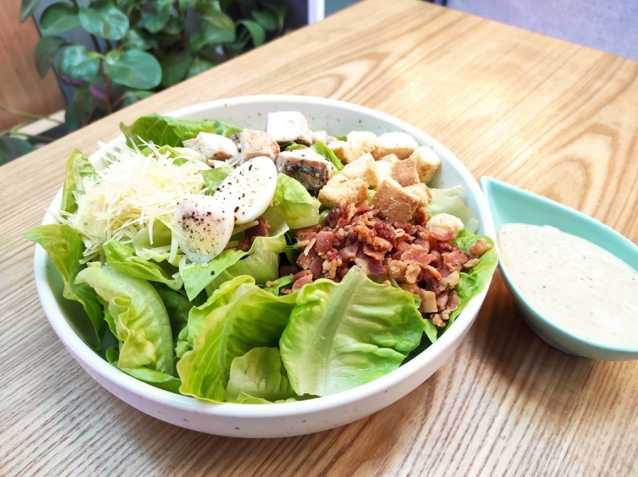 ผักคอส ไก่ย่าง เบคอนกรอบ ไข่นกกระทาออร์แกนิก ชีสพาร์เมซาน และน้ำสลัดซีซาร์ เล็ก 140.00 ฿ ใหญ่ 210 ฿