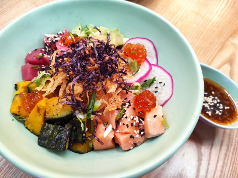 เมนูข้าวหน้าสไตล์ญี่ปุ่น ท๊อปปิ้งด้วย ทูน่าดิบสไตล์ซาชิมิ แซลมอนหมัก ไข่ปลาแซลมอน แฮสส์อโวคาโด้ ฟักทองญี่ปุ่น แรดิชอ่อน ต้นหอม หอมทอด สาหร่ายโนริ ซอสงา เสิร์ฟพร้อมกับข้าวแจสเบอร์รี่ออร์แกนิก อร่อยแบบลงตัว 350.00 ฿