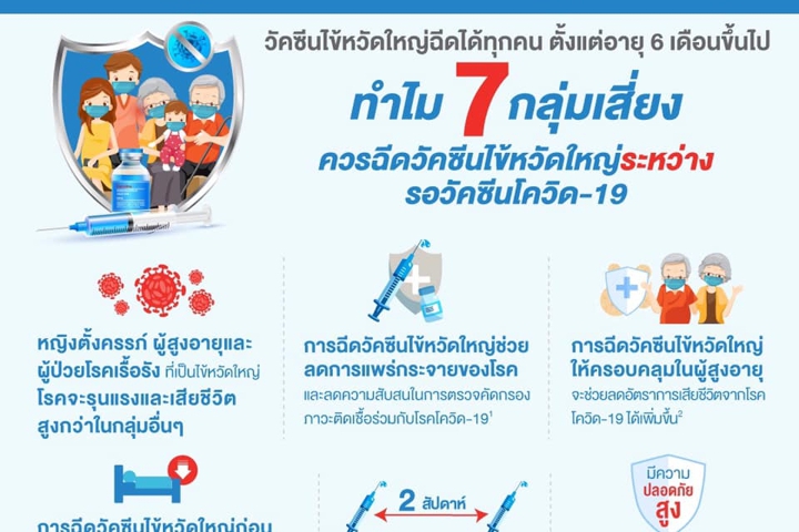 ด้วยสถานการณ์การติดเชื้อไข้หวัดใหญ่ของไทยในปัจจุบันพบได้ทุกอายุ โดยผู้ป่วยส่วนใหญ่จะอยู่ในเด็กช่วงอายุ 0-4 ปี รองลงมาคือเด็กอายุ 5-14 ปี ขณะที่ในประเทศไทยยังไม่มีมาตรการฉีดวัคซีนโควิด-19 ให้กับเด็กอายุต่ำกว่า 12 ปี จึงแนะนำให้ผู้ปกครองควรพาบุตรหลานไปรับวัคซีนไข้หวัดใหญ่ก่อน เพื่อลดความเสี่ยงที่จะติดเชื้อร่วมกันทั้งจากเชื้อไวรัสไข้หวัดใหญ่และเชื้อไวรัสโควิด-19 เพราะจะยิ่งทวีความรุนแรงของโรคได้ เช่นเดียวกับกลุ่มผู้สูงอายุ ตั้งแต่ 65 ปีขึ้นไป และผู้ที่มีโรคประจำตัว เช่น เบาหวาน โรคหัวใจ โรคไตวาย โรคตับ ผู้ที่มีภาวะภูมิคุ้มกันบกพร่อง ผู้ที่ได้รับยากดภูมิคุ้มกันก็มีความจำเป็นอย่างยิ่งในการฉีดวัคซีนป้องกันไข้หวัดใหญ่ทุกปี เนื่องจากมีอัตราการเสียชีวิตจากโรคไข้หวัดใหญ่สูงกว่าผู้ใหญ่ที่มีสุขภาพดี ขณะเดียวกันก็ควรได้รับการฉีดวัคซีนโควิด-19 ด้วยเช่นกัน