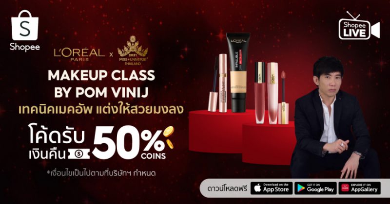 สำหรับเหล่าแฟนนางงามที่ได้รับทิปส์และทริคแต่งหน้าสุดปังจากคลาสสอนแต่งหน้าสุดเอ็กซ์คลูซีฟเรียบร้อยแล้ว ยังสามารถไปช้อปปิ้งกองทัพไอเท็มความงามที่ของมันต้องมีต่อได้ ตั้งวันนี้จนถึงวันที่ 10 ตุลาคม 2564 ในแคมเปญ Shopee 10.10 Brands Festival ที่จะได้พบกับแบรนด์ชั้นนำภายในเครือลอรีอัล อาทิ ลอรีอัล ปารีส (L’Oreal Paris) การ์นิเย่ (Garnier) และ เมย์เบลลีน (Maybelline) ลดราคาสูงสุดถึง 50% พร้อมโค้ดส่วนลดเพิ่ม 500 บาท และสิทธิความเลอค่าสุดพิเศษอีกคับคั่ง เมื่อชำระเงินผ่าน ShopeePay