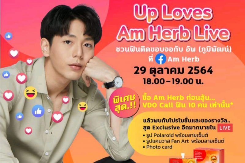 แบรนด์ Am Herb เอาใจสายวายด้วยโปรโมชั่นพิเศษที่จะทำเอาสายวายใจเต้นระรัว ด้วยกิจกรรมUp Love Am Herb Live พบกับการไลฟ์สด ของอัพ ภูมิพัฒน์ ในวันที่ 29 ตุลาคมนี้ เวลา 18.00 น. ถึง 19.00 น. นี้ ที่เพจ Facebook : Am Herb สาวๆ. จะได้ลุ้น VDO Call กับน้องอัพ และรับถุงผ้า, หมอนอิง, ภาพโพลารอยด์พร้อมลายเซ็น หรือภาพแคนวาสขนาดใหญ่พร้อมลายเซ็น รูปลาย Fan Art สุดต๊าชเอ็กซ์คลูซีฟจากแบรนด์อัมเฮิร์บเท่านั้น ไปเป็นที่ระลึกให้ฟินกันอีกด้วย สำหรับคุณสาวๆ ที่ซื้อผลิตภัณฑ์โปรโมชั่นสุดพิเศษของแบรนด์ Am Herb ร่วมลุ้นเข้าร่วมกิจกรรมนี้